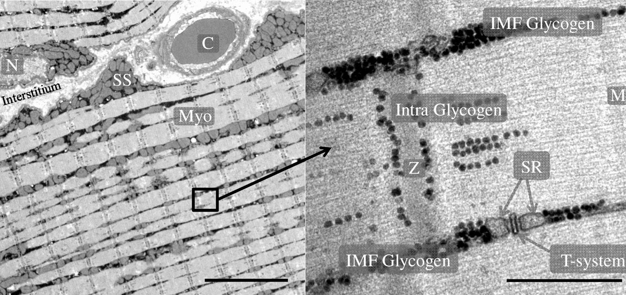 Electron microscopy images showing muscle glycogen droplets (“intra” and “IMF” stands for intra- and inter-myofibrillar glycogen).